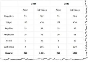 Verstorben ist ein Pfeilgiftfrosch, und ein männlicher Stirnlappenbasilisk musste krankheitsbedingt eingeschläfert werden. Im Vogelbestand verstarb eine Eiderente, vermutlich durch Raubzeug.