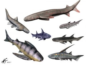 Placodermi (wie Dunkleosteus) und die Stachelhaie (Acanthodii).
