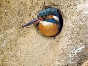 Zu Beginn des Höhlenbaus sitzt das Brutpaar vor einer Steilwand, bis das Männchen plötzlich losfliegt und kurz im Rüttelflug vor einer geeignet erscheinenden Stelle verharrt, um mit dem Schnabel in die Erdwand zu hacken. Danach kehrt es auf den Ast oder die Wurzel zurück, um sich Erdreste vom Schnabel zu reiben und arbeitet danach weiter. Bald beteiligt sich auch das Weibchen, und nach einiger Zeit haben sich beide auf eine Stelle für die Anlage der Höhle geeinigt, so dass sie nun abwechselnd das Loch vergrößern. Nachdem ein Halt für die Krallen entstanden ist, kann jeweils mehrmals zugehackt werden. Meist hält dabei einer der beiden Vögel Wache. Wurde der Tunnel bereits ein Stück weit in die Wand getrieben, wird die freigegrabene Erde mit den Krallen nach hinten gescharrt und rückwärts aus der Röhre geschoben. Erst wenn der Kesselbau begonnen hat, kann der Eisvogel mit dem Kopf voraus aus der Höhle kommen. Stellt ein Stein oder eine Wurzel ein Hindernis dar, wird das Problem entweder mit einer Krümmung der Röhre umgangen oder an anderer Stelle gänzlich neu begonnen. Der Bau einer Bruthöhle kann zwei bis drei Wochen dauern. Fertiggestellte Höhlen werden zur Markierung mit weißen Kotspritzern gekennzeichnet.